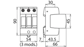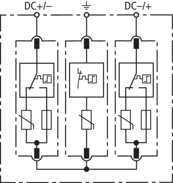 Modular multipole surge arrester with three-step d.c. switching device for use in PV systems; with remote signalling contact for monitoring device (floating changeover contact).