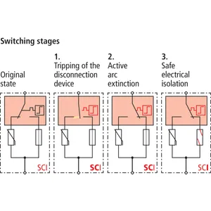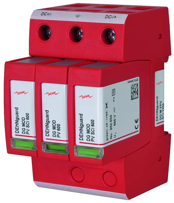 The patented SCI technology with active arc extinction allows to actively, quickly and safely extinguish a possible switching arc in case of overload. The PV fuse integrated in the short-circuit path trips immediately after the arc has been extinguished, thus ensuring safe electrical isolation (interruption). Consequently, all PV arresters from DEHN combine surge protection, fire protection and personal protection in a single device