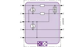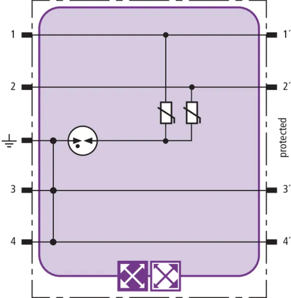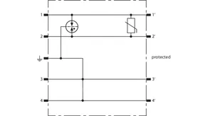 Space-saving combined lightning current and surge arrester module with RFID LifeCheck for protecting four single lines sharing a common reference potential as well as unbalanced interfaces. If LifeCheck detects thermal or electrical overload, the arrester has to be replaced. This status is indicated contactlessly by the DEHNrecord LC / SCM / MCM reader.