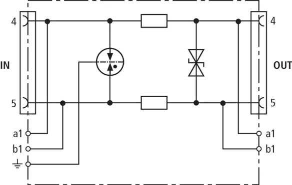 Energy-coordinated and leakage-current-free surge arrester for a/b lines, ISDN Uk0 or ADSL with RJ45 connections and additional screw terminals. Pinning of the RJ45 sockets is compatible with RJ11/12. The parallel screw terminals are more robust than the RJ45 sockets and increase the total nominal discharge current to 10 kA.