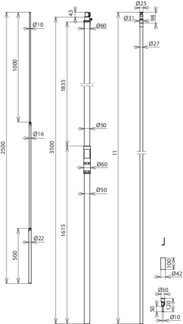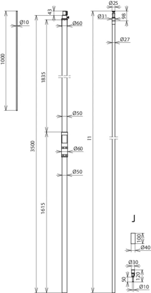 Max. free length with air-termination tip (wall mounting): 3500 mm