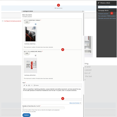 Füge die Section Homepage modules hinzu (siehe dazu oben unter Company purpose).