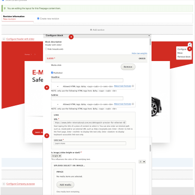 4. Füge der Section die Komponente Header with slider über "add block" hinzu und wähle die Einstellungen für die Komponente "Configure block" aus.