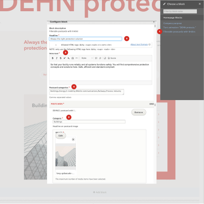 Diese Seite bietet eine Übersicht aller Drupal 9-Komponenten der DEHN-Homepage. Anhand der entsprechenden Erläuterungen erfahrt Ihr, wie sie Schritt für Schritt erstellt, editiert bzw. angepasst werden können. Über das Inhaltsverzeichnis (Übersicht) gelangt man per Sprungmarke zur gewünschten Komponente.