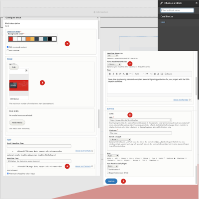 1. Füge die Komponente Filterable postcards with linklist über "add block" hinzu und wähle die Einstellungen für die Komponente aus.