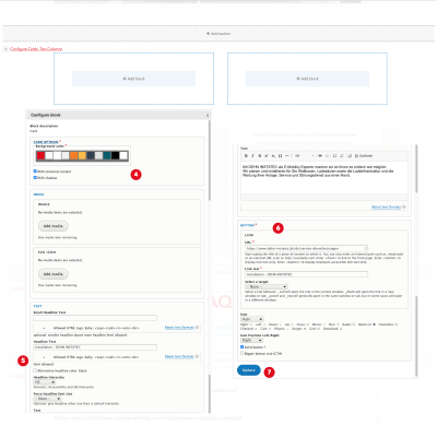 6. Füge unterhalb des Textes einen "Link button / download button" hinzu. Und lade entweder ein Dokument hoch oder wähle eines aus der Mediendatenbank aus. Benenne den Button (Button text) und setze ein Häkchen bei "Solid button".