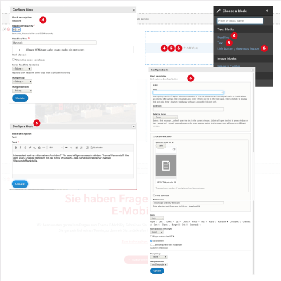 4. Anschließend füge über "Add block" Text sowie einen Link button / download button hinzu.