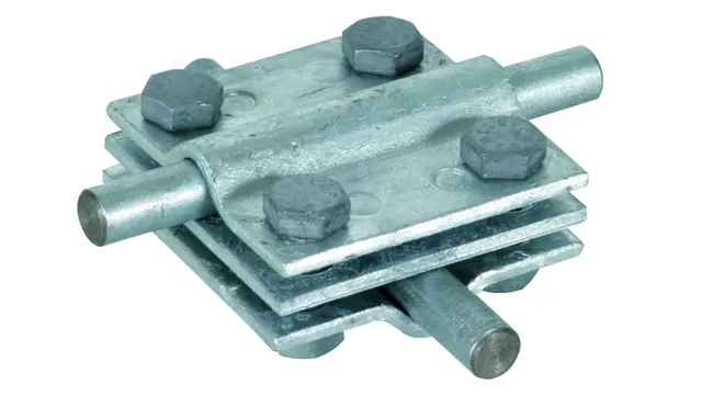 Kreuzstück nach SN EN 62561-1, für ober- und unterirdische Verbindung von Rund- und Flachleitern. Ausführung mit Zwischenplatte und Schrauben M8.