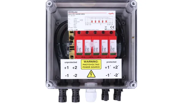The prewired DEHNcube PV system solution protects inverters and PV modules from surges. The generator junction box is available for 1 MPP, 2 MPP and 3 MPP applications, as well as commonly used inverter types. With MC4 connector or screw connection technology.