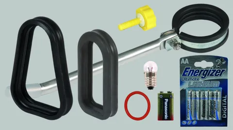 Reservedele (pære, batteri, faldsikringsgummi, pakning osv.) til vores sikkerhedsudstyr.