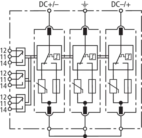 | Nominel afledningsstrøm (8/20 µs) [(DC+/DC-) --> PE] (In ) | 12,5 kA |