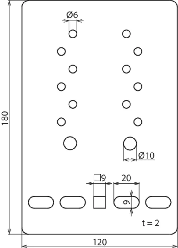 | Befestigungsbohrungen für Gitterbahn | [4x] 9 x 20 / [1x] 9 x 9 mm |
