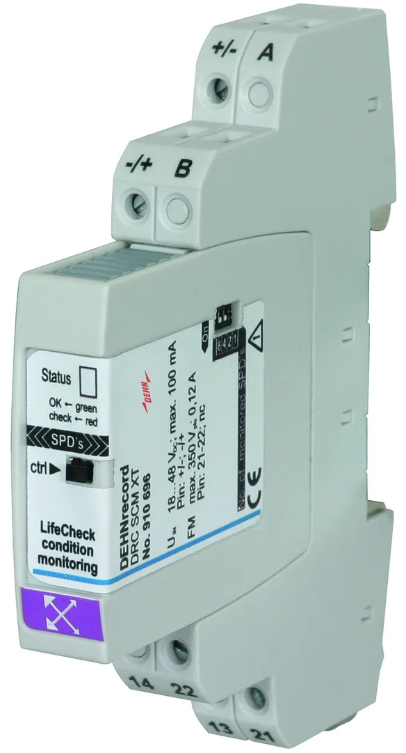 Hutschienengerät mit integriertem RFID-LifeCheck-Sensor für die zustandsorientierte Überwachung von max. 10 BLITZDUCTOR XT/XTU mit RFID-LifeCheck. Optische Ableiter-Zustandsmeldung über 3-Farben-LED kombiniert mit FM-Signalisierung (Öffner oder Schließer). Über die integrierte RS485-Schnittstelle können bis zu 15 DRC MCM XT in einem System mit bis zu 150 BLITZDUCTOR XT/XTU Ableiter überwacht werden.