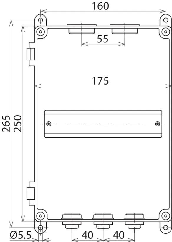 Insulating enclosure with a max. capacity of 12 modules for non-exhausting arresters; with integrated elastic sealing grommet for entering the cables; ideally suited for series connection.