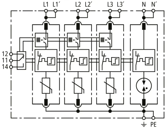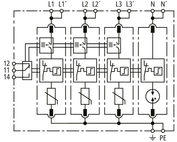 Modular surge arrester with Advanced Circuit Interruption (ACI) for TN-S systems (4+0 configuration); with floating remote signalling contact.