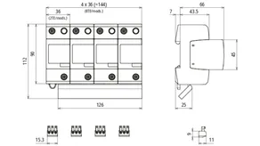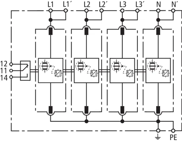 Kit consisting of pluggable lightning and surge arresters, including insulated module wiring bar for use in inverter systems with active anti-PID with maximum DC offset of 750 V DC. Wiring of the earthing systems in accordance with IEC 60364-4-44, Table 44.A1 – RE and Z as well as RE and RA connected.