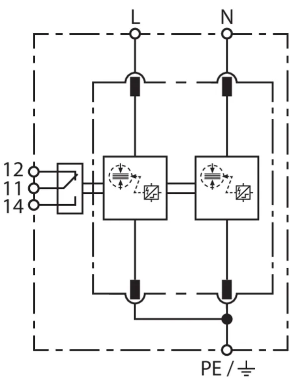 Modular combined lightning current and surge arrester for single-phase TN systems with a nominal voltage of 230 V (2+0 configuration); FM version with floating remote signalling contact.