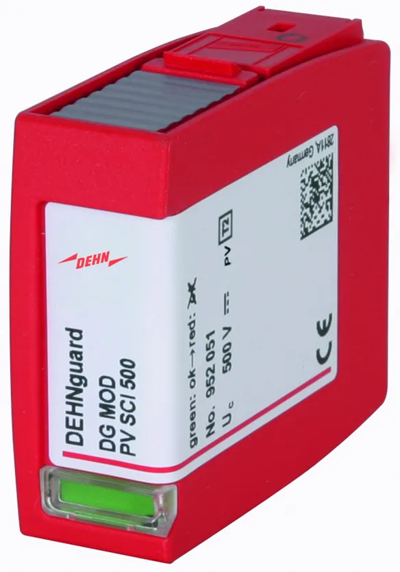 The patented SCI technology with active arc extinction allows to actively, quickly and safely extinguish a possible switching arc in case of overload. The PV fuse integrated in the short-circuit path trips immediately after the arc has been extinguished, thus ensuring safe electrical isolation (interruption). Consequently, all PV arresters from DEHN combine surge protection, fire protection and personal protection in a single device
