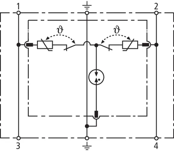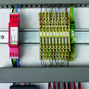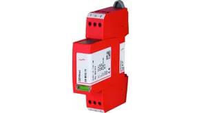 Two-pole surge arrester consisting of a base part and a plug-in protection module; with floating remote signalling contact. Can be used for systems with a load current up to 32 A.