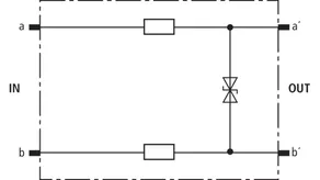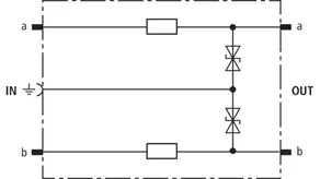 Protective plug (one pair), energy-coordinated with DRL plug-in SPD block, for use as single-stage protective device for terminal equipment for high-frequency transmissions such as G.703 or ISDN U2m, S2m and S0. To be mounted into EF 10 DRL. Installation recommended only in combination with DRL plug-in SPD block.