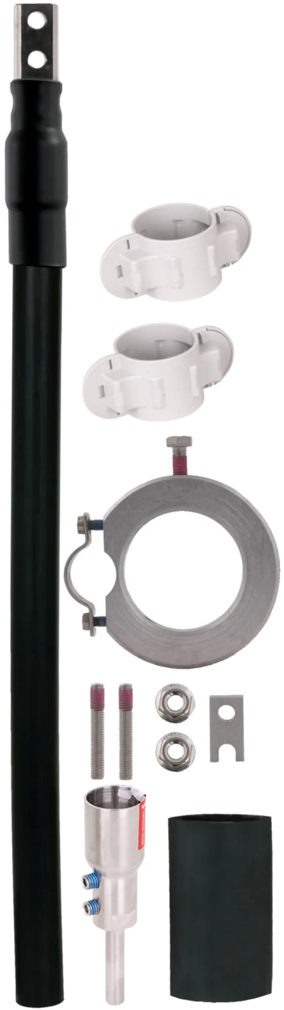 Connection kit for installing the HVI power Conductor on HVI power supporting tubes GRP / Al consists of threaded pins, a connection part, heat-shrinkable sleeve and fixing ring with slotted conductor holder (Ø27 mm) for the sealing end (including cable ties).