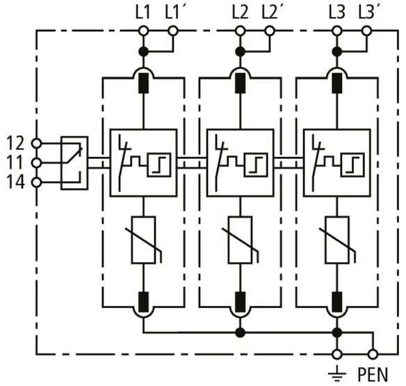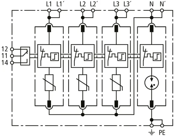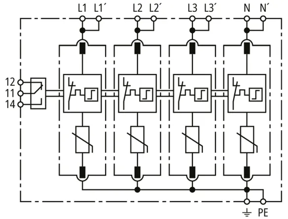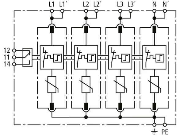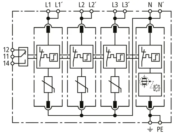 Modular surge arrester for TT and TN-S systems (3+1 configuration); with floating remote signalling contact.