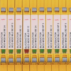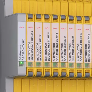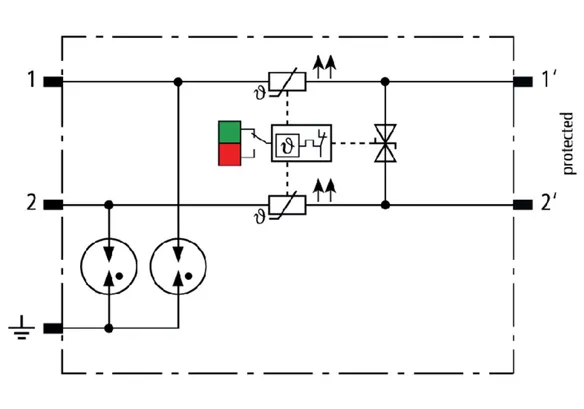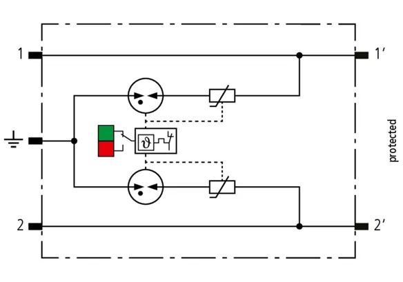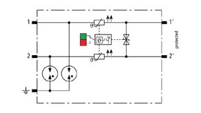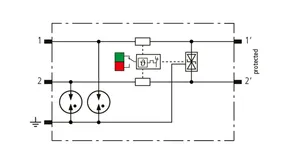 Space-saving, modular lightning current arrester with a width of 6 mm and push-in connection technology with status indication for protecting two single lines for lightning equipotential bonding as well as indirect earthing of shielded cables. With signal disconnection for maintenance purposes.