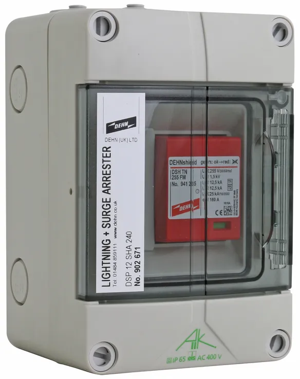 enclosure equipped with DEHNshield combined lightning current and surge arrester (Part No. 941 310)