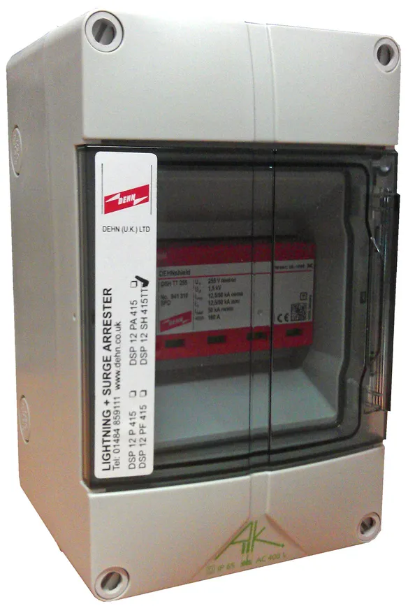 Mains connection box kit for the three-phase 240/415 V TNS system consisting of IP 65 enclosure equipped with combined lightning current and surge arrester DEHNvenCI (Part No. 961 200) or as version ... PA ... equipped with combined lightning current and surge arrester (Part No. 961 205) with integrated remote signalling contact for monitoring device