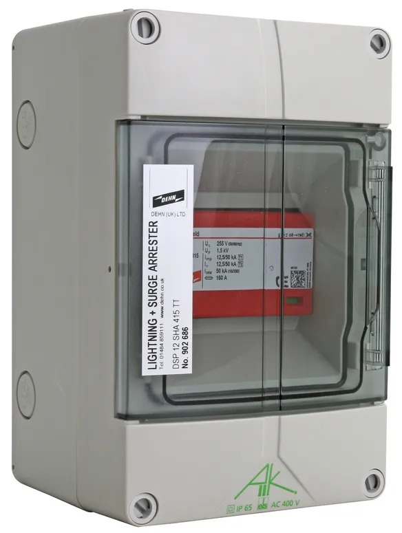 Mains connection box kit for three-phase 240/415 V TN(C)-S systems consisting of an IP 65 enclosure equipped with DEHNshield application-optimised and prewired combined lightning current and surge arrester (Part No. 941 400) or type ... SHA ... equipped with application-optimised and prewired combined lightning current and surge arrester (Part No. 941 405) with integrated remote signalling contact for monitoring device.