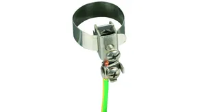 Earthing pipe clamps for integrating pipes into the protective and functional equipotential bonding according to IEC 60364-4-41/5-54, with continuously adjustable tensioning strap.