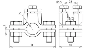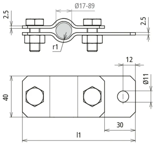 Connection for flat conductor with screws and nuts, for round steel 7–10 mm, e.g. KS connector part no. 301 000 or clamping piece part no. 390 150.