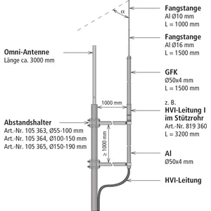 En la instalación de elementos de captación separados para antenas Omni debe tenerse en cuenta que una punta captadora separada cubre la antena a proteger con un ángulo de protección suficiente.