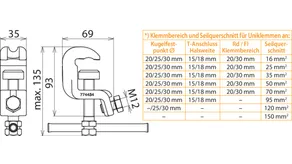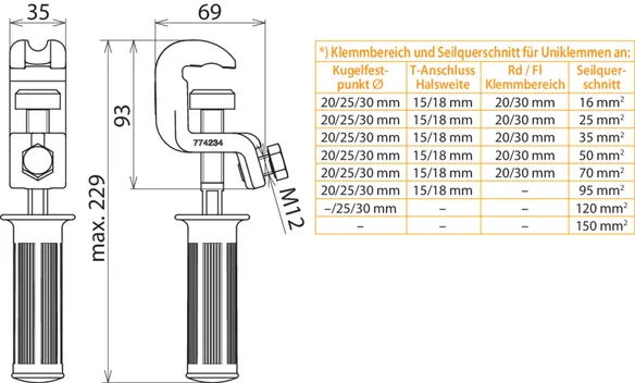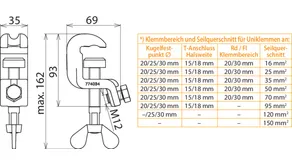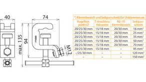 | *) Voir le tableau pour les plages de serrage et section max. de câble pour pinces universelles | |