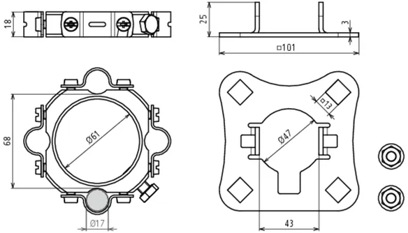 Set de fixation pour le montage d’un conducteur HVI light sur des tubes supports Ø50 mm (par ex. tube support HVI long), comprenant une plaque de raccordement (4 niveaux, deux écrous à embase crantée inclus) et une bague de fixation avec quatre porte-câbles fendus (Ø17 mm) pour la zone d’adaptation (deux fixations pour câble incluses).
