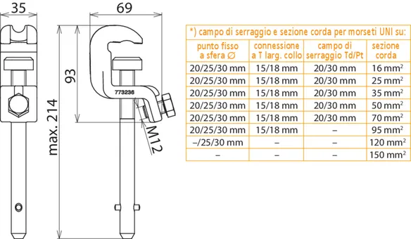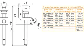 | *) Vedi tabella del campo di serraggio e sezione trasversale massima della corda per pinze universali | |