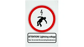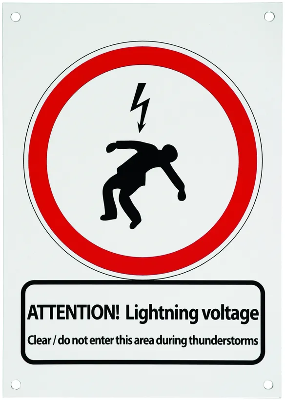 Sign "Achtung Blitzspannung" Information sign Front German "ACHTUNG! Blitzspannung Bei Gewitter Bereich räumen / nicht betreten" Reverse side Englisch "ATTENTION! Lightning voltage Clear / do not enter this area during thunderstorms"